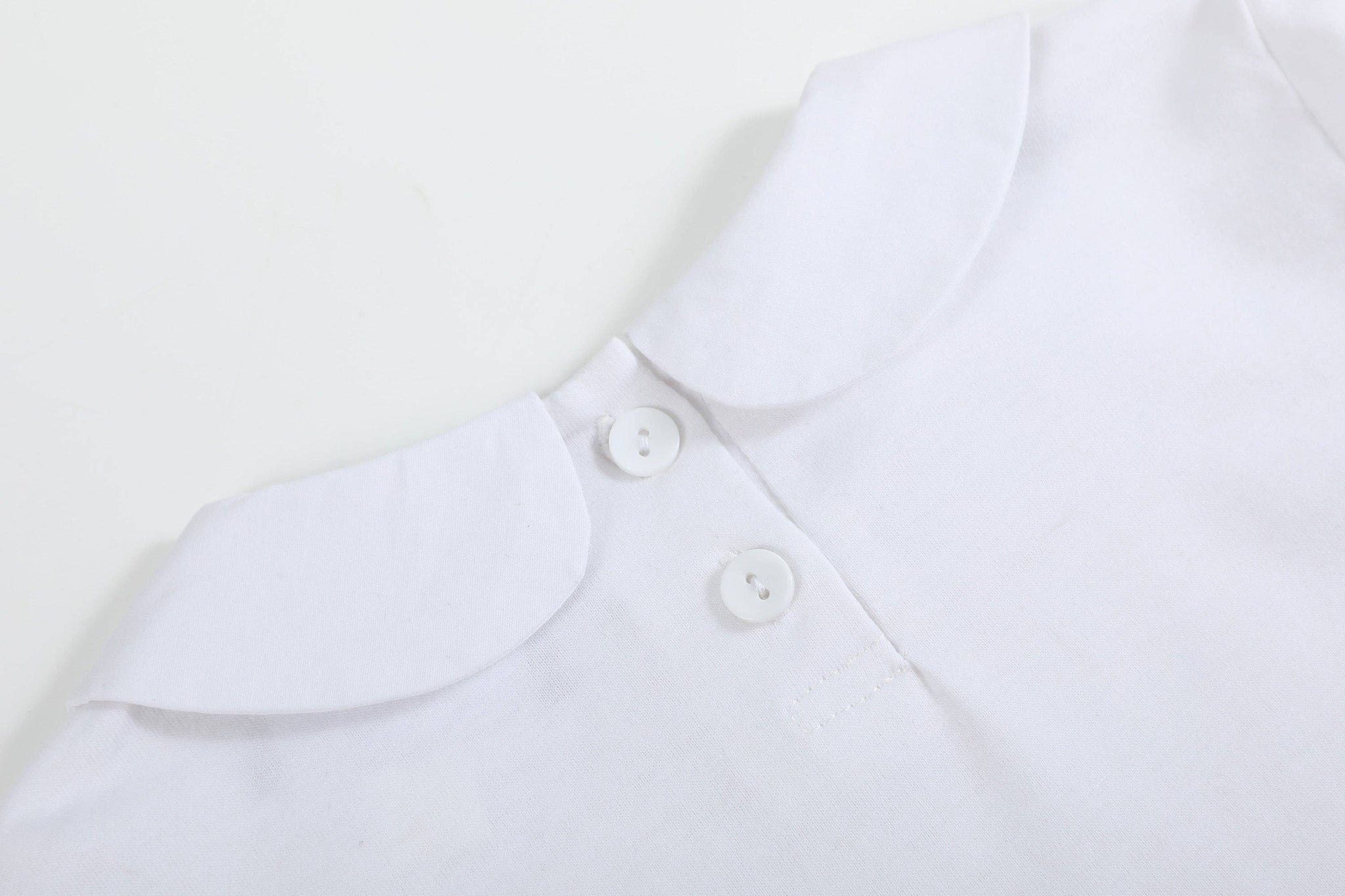 Celebrate the season with this White Cotton Santa Collared Shirt, perfect for little girls. Made from 100% cotton for comfort and softness, this long-sleeved shirt features an adorable collar embroidered with festive Santas. Ideal for Christmas gatherings or seasonal wear, it pairs beautifully with our Ruffle Jumper Dresses.